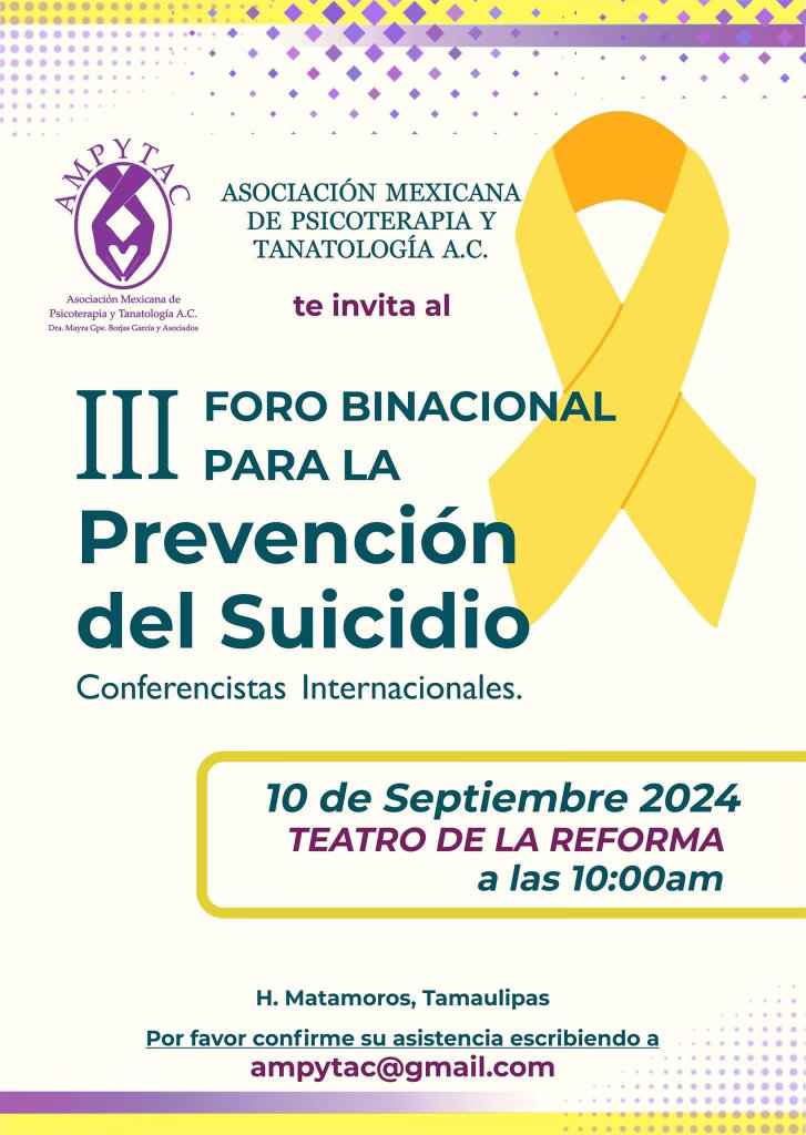 III Foro Binacional Para la Prevencion del Suicidio AMPYTAC Asociación Mexicana de Psicoterapia y Tanatología A.C. Martes, 10 de Septiembre del 2024 Enlace al Poster Enlace al Video ATREVETE A SANAR FollowFollow Ubicación Brownsville, TX TEL 956-466-3500 Email LupitaSalazarPsicoterapeuta@gmail.com